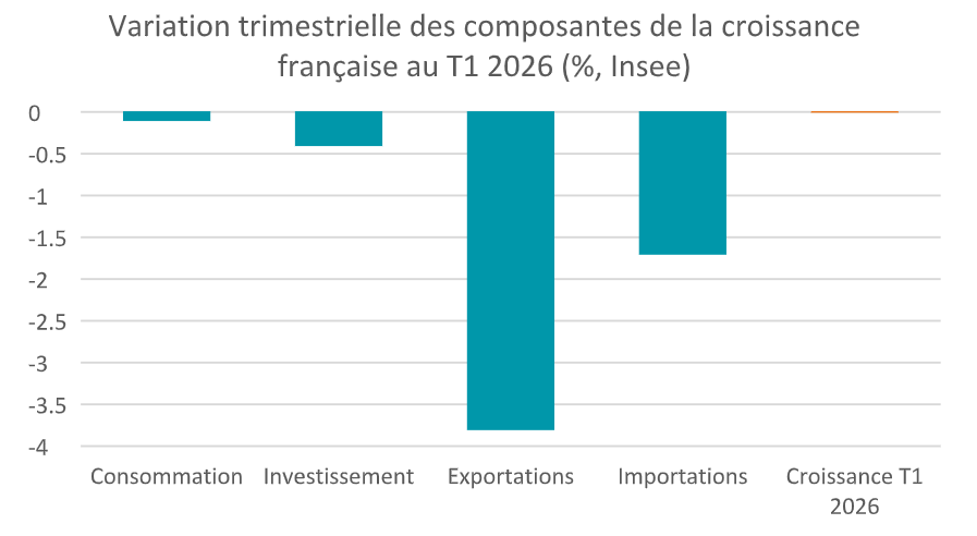 S’il ne faut jamais trop extrapoler à partir des chiffres trimestriels par nature volatils (d’autant plus qu’ils peuvent être révisés par la suite), la tendance de la croissance française n’incite pas à l’optimisme alors même que l’impact de la guerre au Moyen-Orient ne s’est pas encore pleinement fait sentir dans les évolutions du premier trimestre.