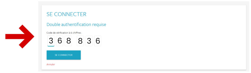 Le code à usage unique qui est apparu dans l’application de votre téléphone est à rentrer sur la page du site pour finaliser la mise en place de la double authentification.