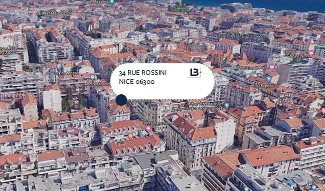 L'immeuble est situé au cœur de Nice, destination phare du tourisme mondial, au croisement de la rue Rossini et de Berlioz dans le quartier des musiciens. En quelques minutes, vous pouvez rejoindre la gare centrale, la station de tramway sur l’avenue Jean Médecin, la place Massena, le Vieux-Nice ou la Promenade des Anglais. C’est un quartier emblématique de la ville : à la fois chargé d’histoire et doté d’un charme bien particulier idéal pour un style de vie urbain. Immeuble de standing de type bourgeois.